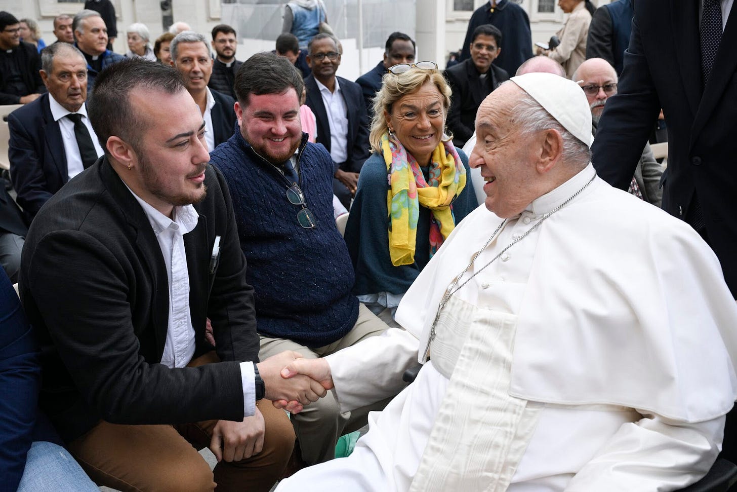 Flash forward to October 23, 2024–where I found myself sitting in a general audience in Rome, the Vatican, meeting Pope Francis. I grasped his hand and told him in Spanish, “I am a transgender man and friend of Fr. James Martin.” He beamed in response, demonstrating more ability to be loving and welcoming than so many Catholics I had encountered before. That this elderly Argentinian man sitting at the very heart of Catholicism—literally in the chair of St. Peter—could welcome not only me but many transgender people and listen attentively to the concerns of our community means that there’s no excuse for coldness or rejection. Jesus himself would likely not recognize those who reject others as his followers. There is no asterisk after the gospel words, “Love your neighbor.”